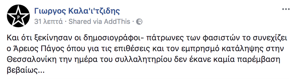 «Και ό,τι ξεκίνησαν οι δημοσιογράφοι-πάτρωνες των φασιστών, το συνεχίζει ο Άρειος Πάγος, όπου για τις επιθέσεις και τον εμπρησμό κατάληψης στη Θεσσαλονίκη, την ημέρα του συλλαλητηρίου, δεν έκανε καμία παρέμβαση, βεβαίως».