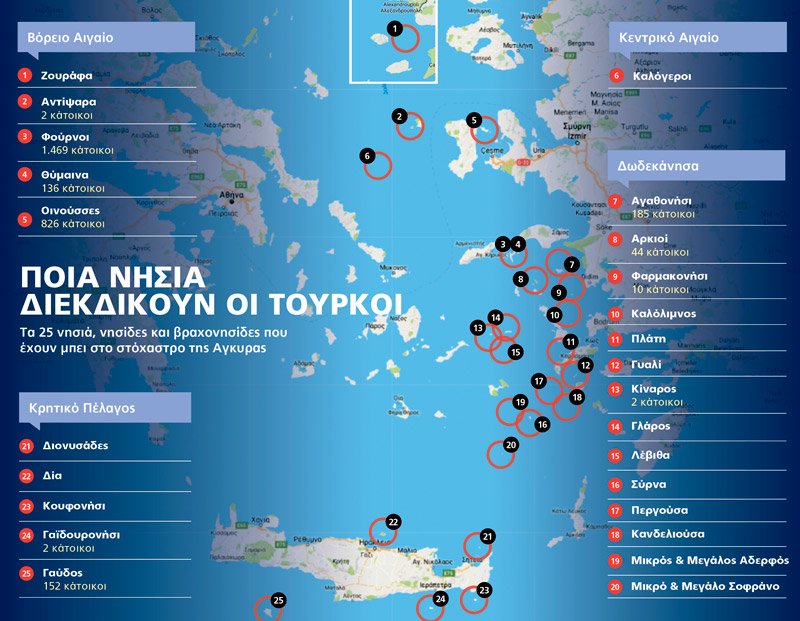 Στις «αμφισβητούμενες περιοχές» για την Τουρκία είναι και το νησιωτικό σύμπλεγμα των Φούρνων Ικαρίας όπου υπάρχουν δεκαεπτά ευαίσθητοι στόχοι: Θύμαινα και Θυμαινάκι, Ξέρα, Κατεργάρικα, Λιμενόπετρα, Αλαφονήσι, Κισιρία, Κουρνιαχτή, Στρογγυλό, Πλάκα, Πλακάκι, Πρασονήσι, Μακρονήσι, Μεγάλος και Μικρός Ανθρωποφάς, Μικρός και Μεγάλος Άγιος Μηνάς.