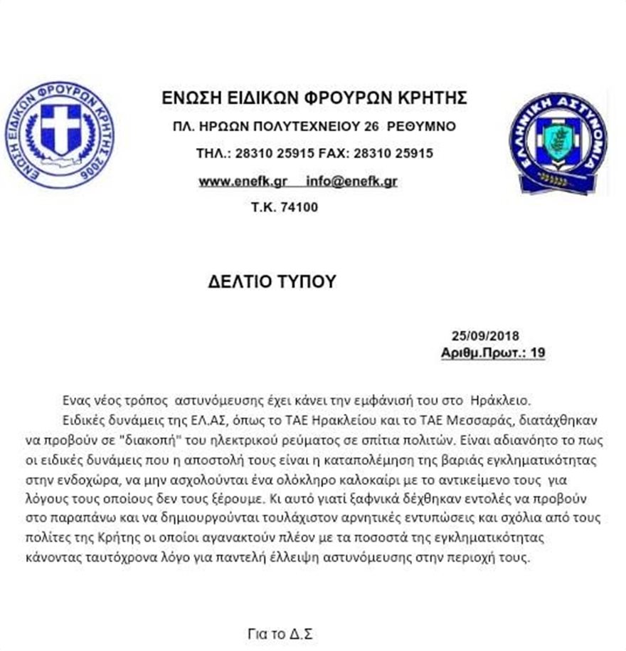 «Ένας νέος τρόπος αστυνόμευσης έχει κάνει την εμφάνισή του στο Ηράκλειο. Ειδικές δυνάμεις της ΕΛ.ΑΣ, όπως το ΤΑΕ Ηρακλείου και το ΤΑΕ Μεσσαράς, διατάχθηκαν να προβούν σε «διακοπή» του ηλεκτρικού ρεύματος σε σπίτια πολιτών. Είναι αδιανόητο το πως οι ειδικές δυνάμεις που η αποστολή τους είναι η καταπολέμηση της βαριάς εγκληματικότητας στην ενδοχώρα, να μην ασχολούνται ένα ολόκληρο καλοκαίρι με το αντικείμενο τους για λόγους τους οποίους δεν τους ξέρουμε. Κι αυτό γιατί ξαφνικά δέχθηκαν εντολές να προβούν στο παραπάνω και να δημιουργούνται τουλάχιστον αρνητικές εντυπώσεις και σχόλια από τους πολίτες της Κρήτης οι οποίοι αγανακτούν πλέον με τα ποσοστά της εγκληματικότητας κάνοντας ταυτόχρονα λόγο για παντελή έλλειψη αστυνόμευσης στην περιοχή τους».