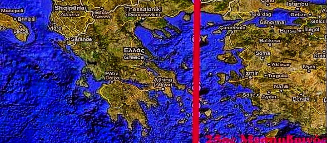 Σύμφωνα με την πάγια τουρκική τακτική, η έρευνα και διάσωση για την Ελλάδα είναι στον 25η μεσημβρινό (!) ο οποίος όπως βλέπεται από τη φωτογραφία, τέμνει το Αιγαίο στη μέση.