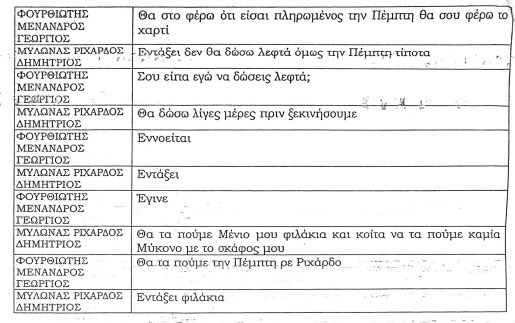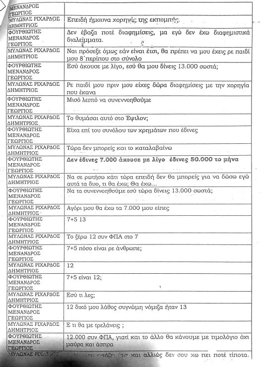 Μένιος: 12 δικό μου το λάθος, συγνώμη νόμιζα ήταν 13. (…) 12.000 συν ΦΠΑ γιατί και το άλλο θα το κάνουμε με τιμολόγιο, όχι μαύρα και άσπρα.