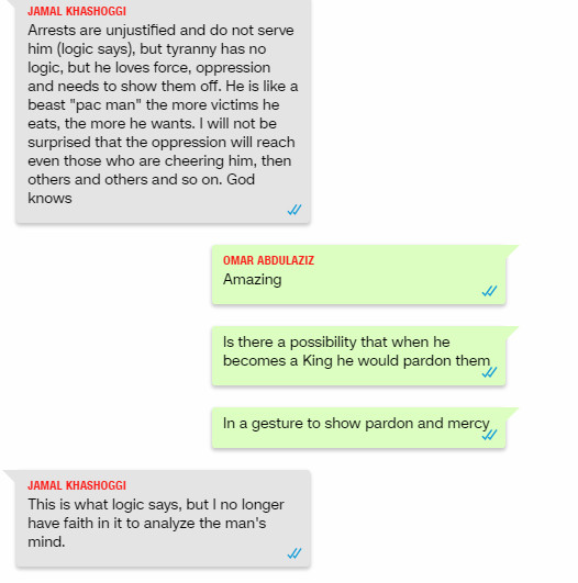 Τα μηνύματα του Κασόγκι στον Ομάρ Αμπντουλαζίζ δημοσιεύει το CNN. Μέσω της εφαρμογής ο δημοσιογράφος είχε μοιραστεί με το φίλο του ηχητικά μηνύματα, φωτογραφίες και βίντεο.