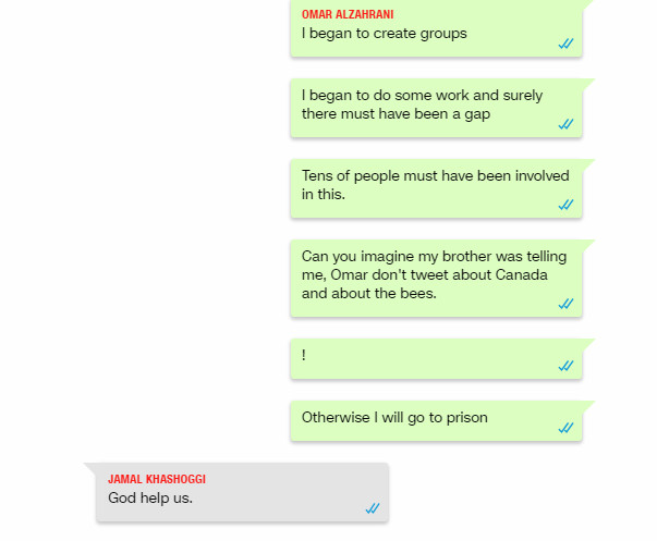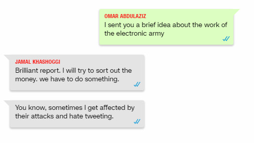 «Σου στέλνω κάποιες ιδέες για τον ηλεκτρονικό στρατό μέσω email», γράφει σε μήνυμα στο WhatsApp ο Ομάρ τον Μάιο. «Τέλεια» του απαντά ο Κασόγκι και συνεχίζει: «Θα προσπαθήσω να μοιράσω τα χρήματα. Πρέπει να κάνουμε κάτι».