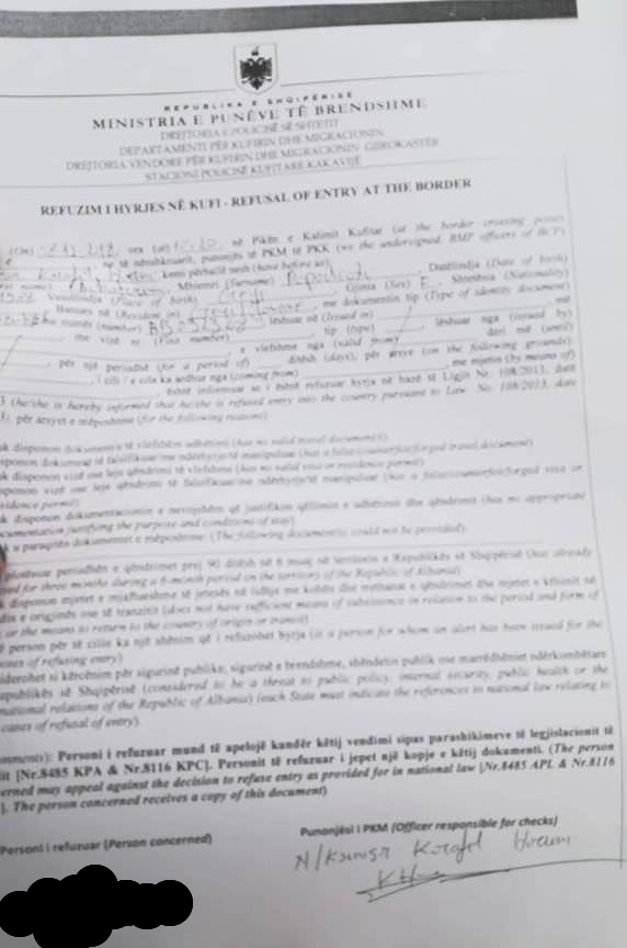 Ύστερα από αρκετή ώρα αναμονής, τους πέρασαν στο σημείο ελέγχουν των ταξιδιωτικών εγγράφων όπου Αλβανίδα αστυνομικός με επιθετικό ύφος τους ρωτούσε στα ελληνικά τον λόγο της επίσκεψης στην Αλβανία. Όποιον λόγο και αν επικαλέστηκαν η απάντηση της Αλβανίδας αστυνομικού ήταν πως για να περάσουν χρειάζονταν γραπτή πρόσκληση από Αλβανό πολίτη. Όλοι κλήθηκαν να υπογράψουν το παρακάτω έγγραφο άρνησης εισόδου στην χώρα.