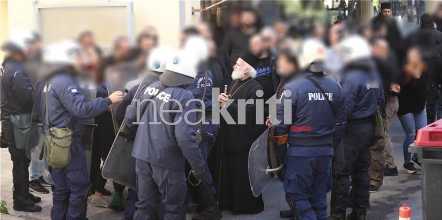 Λίγα λεπτά αργότερα από το χώρο του Ιερού Μητροπολιτικού Ναού βγήκε ο Αρχιεπίσκοπος Κρήτης Ειρηναίος, που κατευθύνθηκε προς τους συγκεντρωμένους αντιεξουσιαστές προκειμένου να τους εξηγήσει ότι η εκκλησία δεν έχει θέση σε τέτοιου είδους αντιπαραθέσεις.