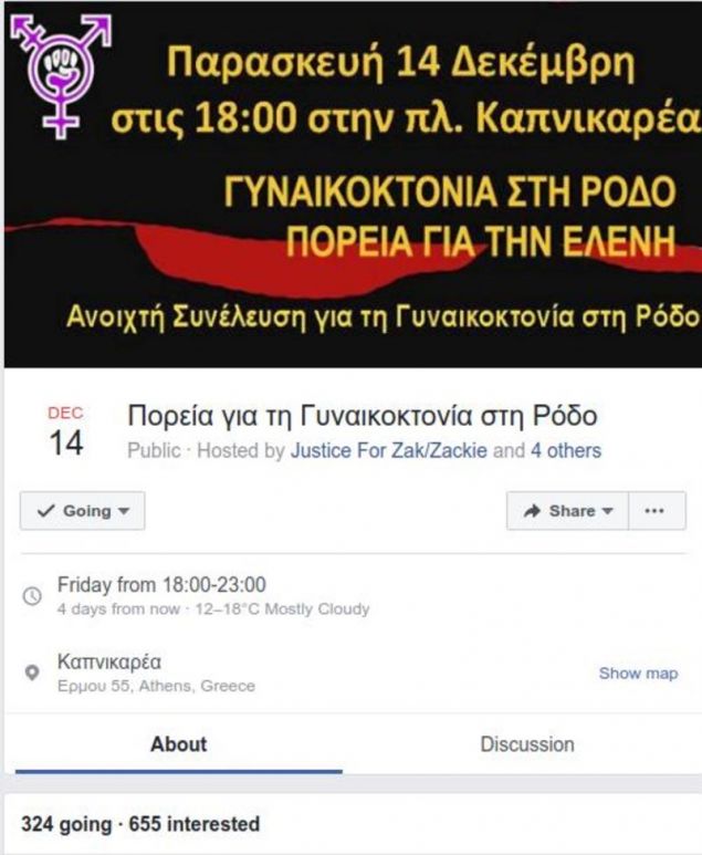 Με τον τίτλο «Πορεία για την Ελένη», η ανοιχτή συνέλευση για τη Γυναικοκτονία στην Ρόδο, καλεί την προσεχή Παρασκευή, 14 Δεκεμβρίου, σε συγκέντρωση και πορεία στο κέντρο της Αθήνας.
