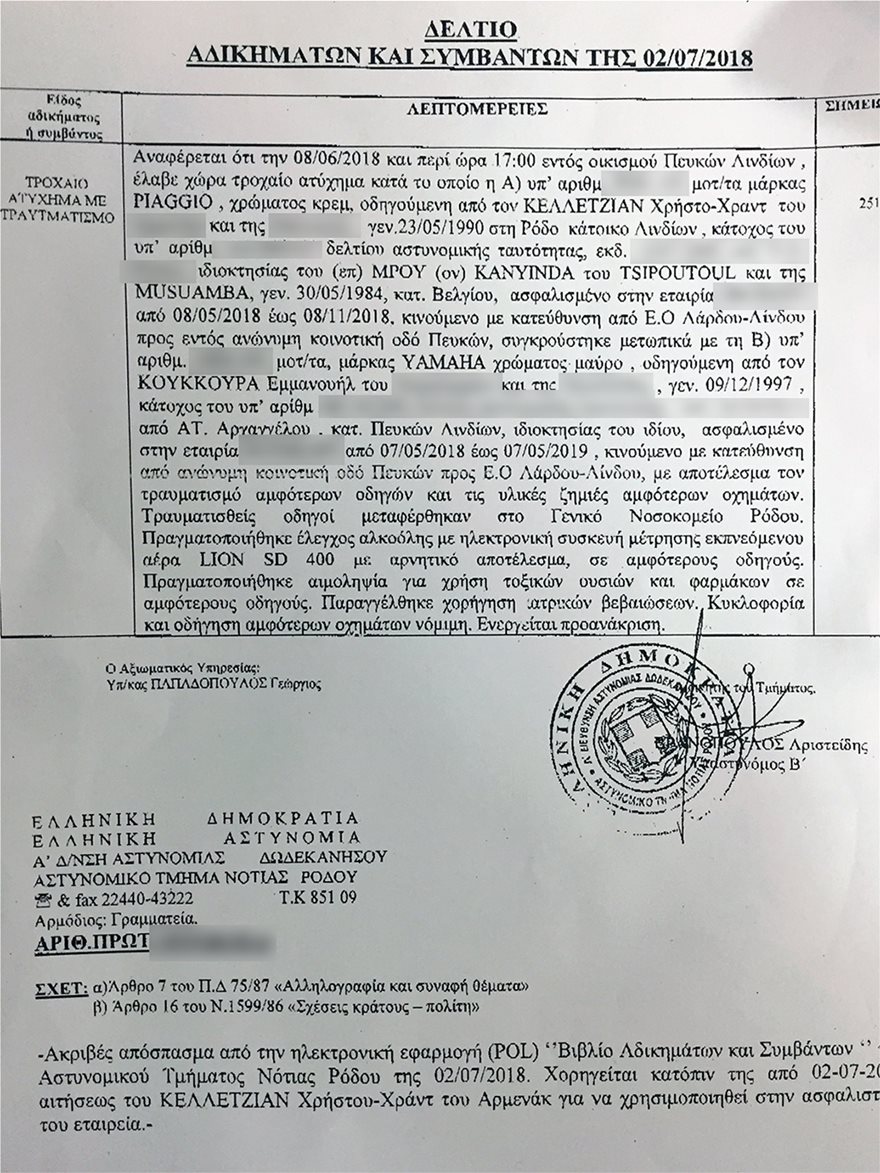 Σύμφωνα με το δελτίο αδικημάτων και συμβάντων της αστυνομίας, το τροχαίο ατύχημα στο οποίο εμπλέκεται ο κατηγορούμενος για τον φόνο της 21χρονης φοιτήτριας συνέβη την 08/06/2018 και ώρα 17.00 εντός του οικισμού Πευκών Λινδίων. Σύμφωνα με τα όσα αναφέρονται στο δελτίο, ο αθλητής της πάλης Χρήστος Κελετζίαν κινούνταν με την βέσπα του με κατεύθυνση από Ε.0 Λάρδου- Λίνδου προς την οδό Πευκών όταν συγκρούστηκε μετωπικά με μια μηχανή μάρκας Yamaha, οδηγός της οποίας ήταν ο Μανώλης Κούκουρας.