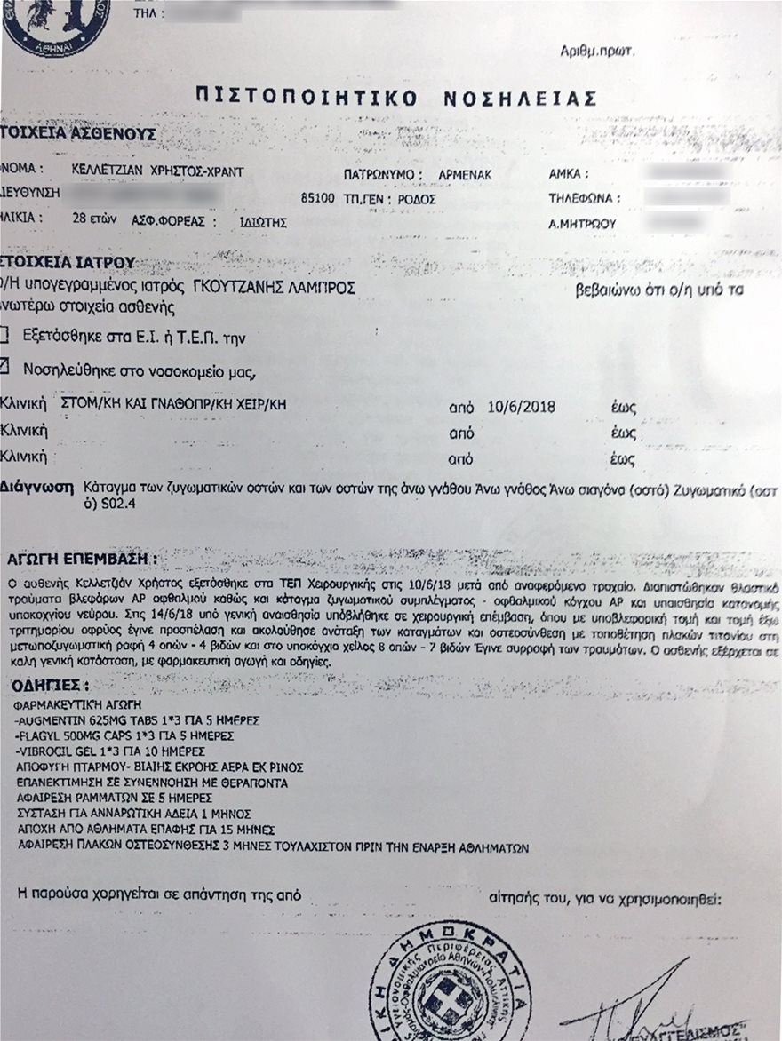 Σύμφωνα με πιστοποιητικό νοσηλείας του αθλητή στο νοσοκομείο «Ευαγγελισμός», διαπιστώθηκαν θλαστικά τραύματα βλεφάρων – οφθαλμού καθώς και κάταγμα ζυγωματικού συμπλέγματος- οφθαλμικού κόγχου και υπαισθησία κατανομής υποκογχίου νεύρου. Υπεβλήθη σε χειρουργική επέμβαση στις 14/6/2018.