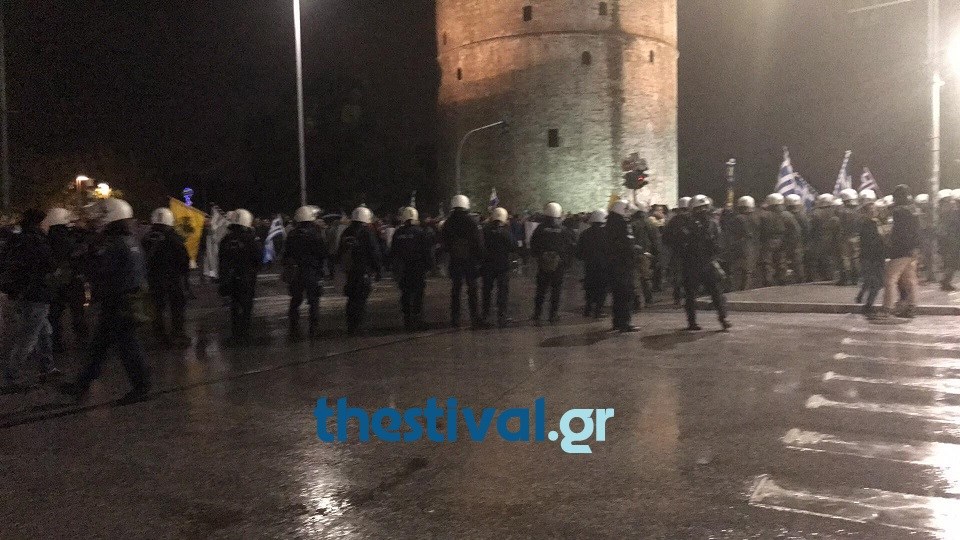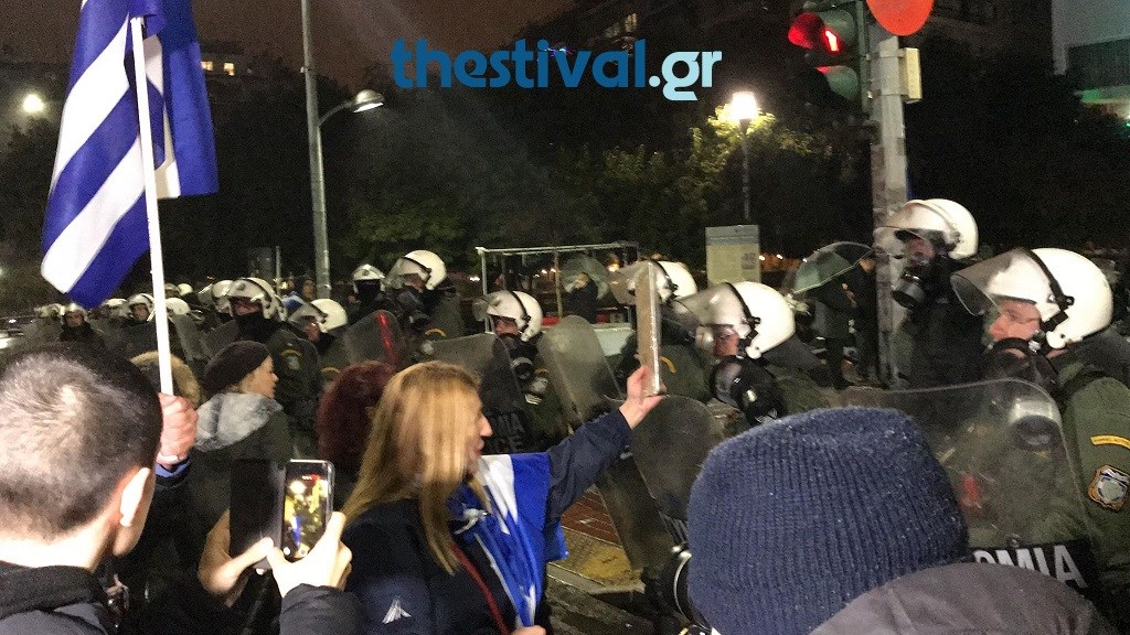 “Ντροπή σας” φώναζαν οι συγκεντρωθέντες στους άνδρες της Ελληνικής Αστυνομίας που τους είχαν φράξει τη δίοδο, ενώ φώναζαν και συνθήματα ενάντια στον Πρωθυπουργό και στη συμφωνία των Πρεσπών ενώ στόχος τους ήταν να φτάσουν μέχρι το Παλαί Ντε Σπορ.