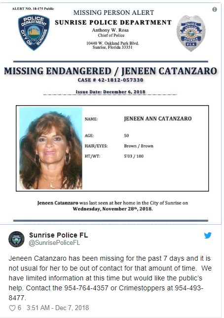 Ο Joseph Traeger, 50 ετών, συνελήφθη για τον φόνο της Jeneen Catanzaro, σύμφωνα με το Α.Τ. του Sunrise, ενώ όπως αναφέρουν η υπόθεση ξεκίνησε αναζητώντας την γυναίκα που είχε δηλωθεί ως εξαφανισμένη.