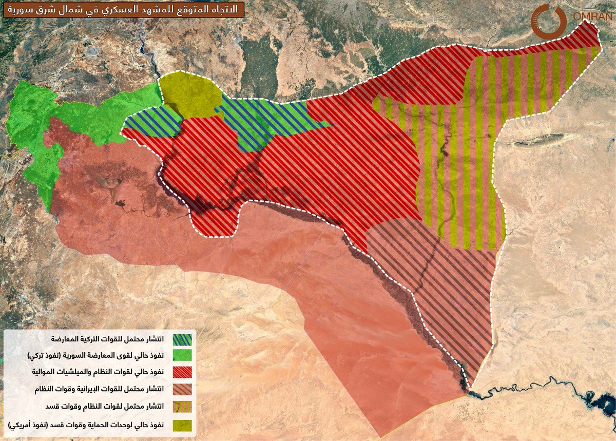 Με τις μωβ γραμμές ιρανικές/ σιιτικές πολιτοφυλακές και με το κόκκινο και κίτρινο χρώμα Κούρδοι μαζί με συριακό Στρατό.