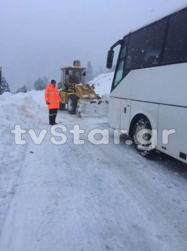 Επιχείρηση απεγκλωβισμού επιβατών λεωφορείου στήθηκε στον Παρνασσό, με τη βοήθεια ενός εκχιονιστικού μηχανήματος!