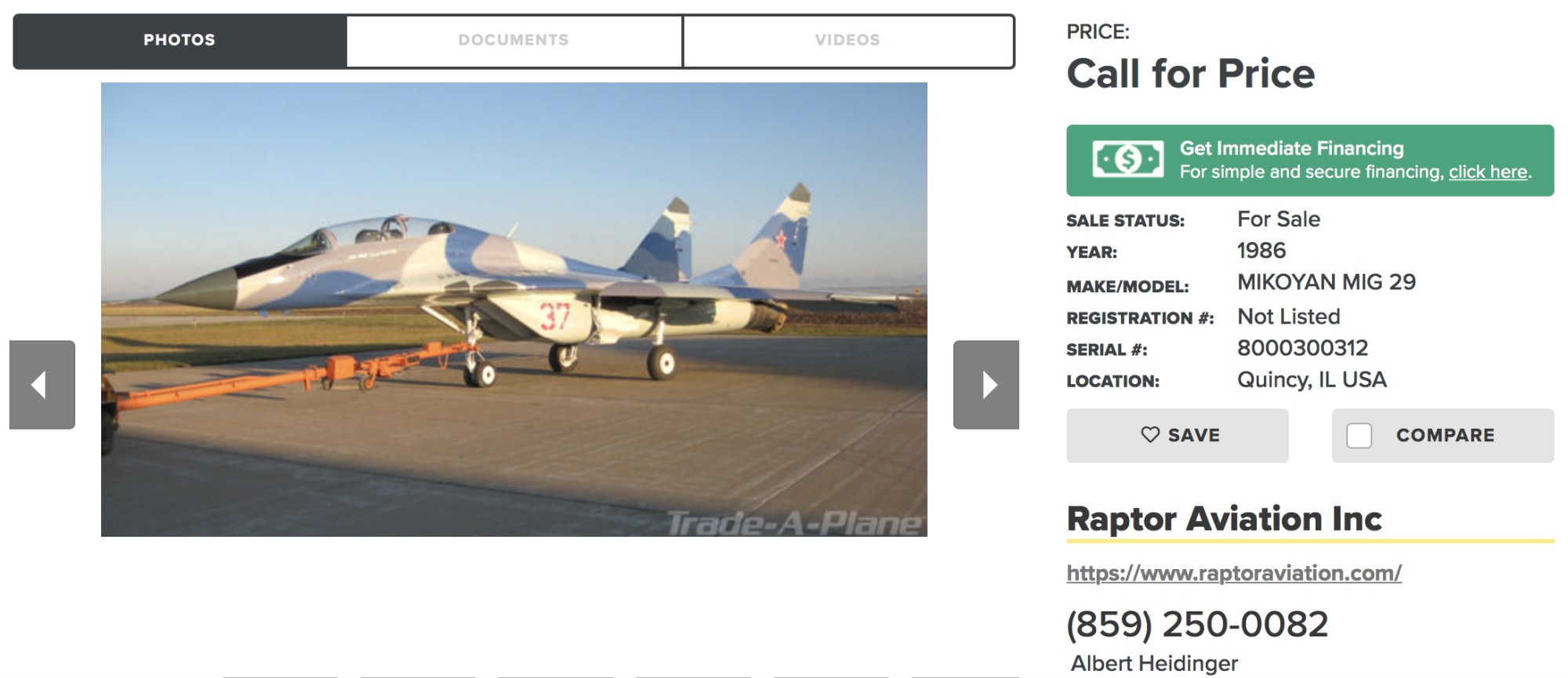 Πρόκειται για ένα διθέσιο MiG-29UB το οποίο κατασκευάστηκε το 1986 στο εργοστάσιο Kalyazinsky κοντά στη Μόσχα έχει μόνο 818 ώρες πτήσης από 1986(!) εκ των οποίων οι 118 μετά την γενική επισκευή του στην Ουκρανία και τώρα πωλείται για 4,65 εκατ. $