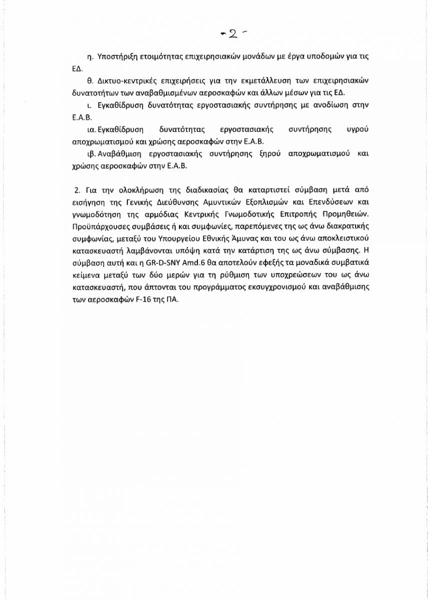 Αποδεκτή γίνεται η προσφορά του αποκλειστικού κατασκευαστή των αεροσκαφών F-16, Lockheed Martin, συνολικής ονομαστικής αξίας τουλάχιστον 230 εκατ. ευρώ, η οποία περιλαμβάνει προγράμματα εκσυγχρονισμού – αναβάθμισης των F-16 της Πολεμικής Αεροπορίας.
