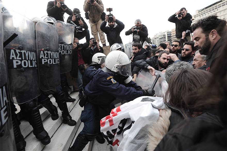Πριν από λίγη ώρα σημειώθηκε ένταση μεταξύ των διαδηλωτών με σπρωξίματα στα σκαλιά στο Σύνταγμα απέναντι από τη Βουλή, ενώ οι αστυνομικοί απάντησαν με χειροβομβίδα κρότου λάμψης.