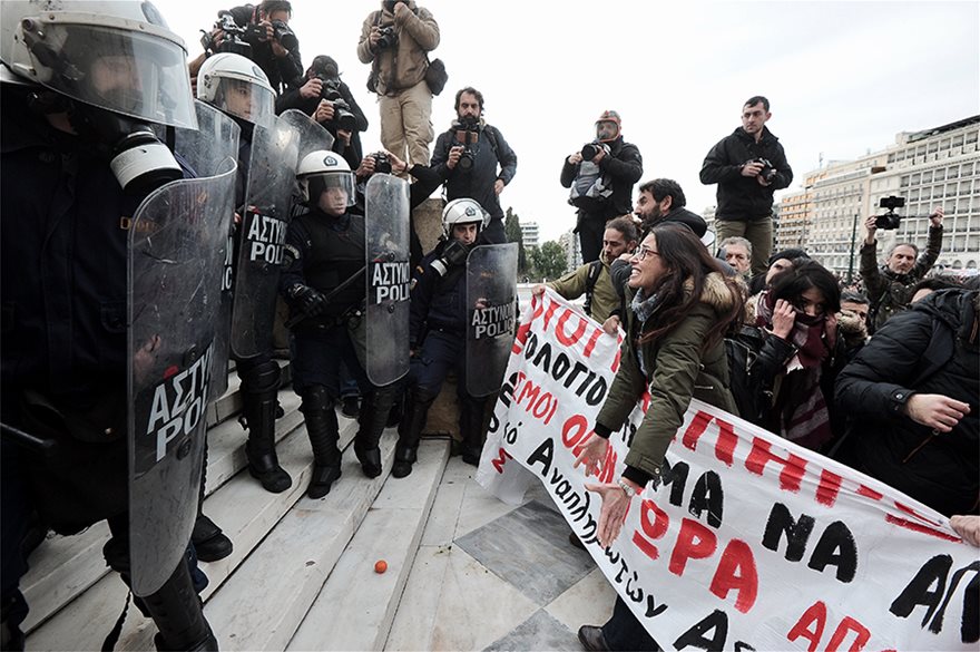 Ένας από τους διαδηλωτές ανέβηκε πάνω στην κλούβα των ΜΑΤ, ζητώντας συνάντηση με τον πρωθυπουργό και τον υπουργό Παιδείας Κώστα Γαβρόγλου.