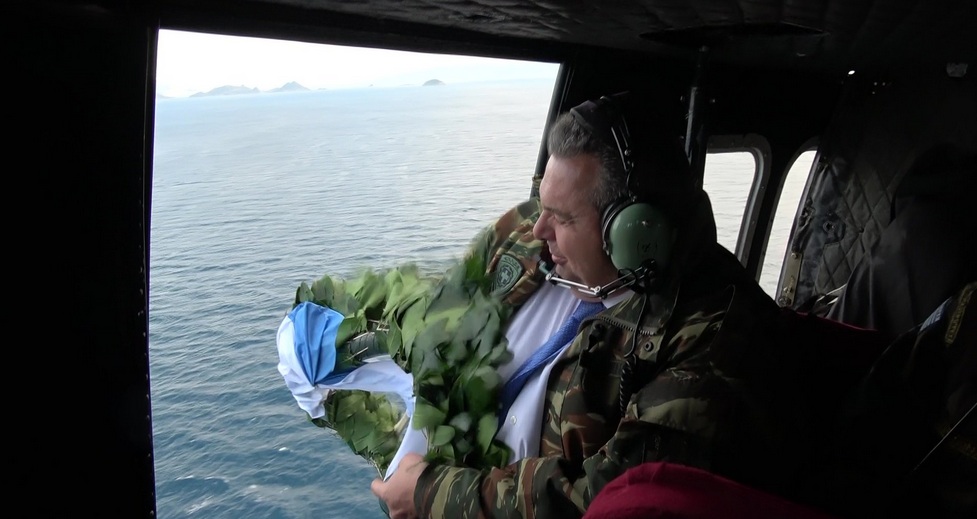 Ο πρόεδρος των Ανεξάρτητων Ελλήνων, Πάνος Καμμένος, μετά την συνέντευξη Τύπου και την αποχώρησή του από την κυβέρνηση πέταξε με ελικόπτερο πάνω απο τα Ίμια πετώντας στεφάνι στη μνήμη των νεκρών ηρώων του ΠΝ.