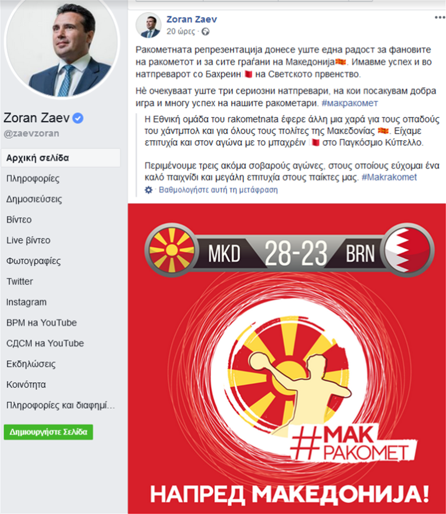 Μια απλή επίσκεψη στην επίσημη σελίδα του πρωθυπουργού της ΠΓΔΜ στο facebook, είναι αρκετή για να αντιληφθεί κανείς ότι ακριβώς την ώρα που στην Ελλάδα ο ΣΥΡΙΖΑ δίνει τον υπέρ πάντων αγώνα για να ψηφιστεί η Συμφωνία εκχωρώντας στους Σκοπιανούς «μακεδονική» εθνότητα και γλώσσα οι τελευταίοι συνεχίζουν το βιολί τους.