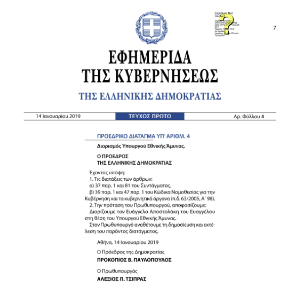 Δημοσιεύθηκε η απόφαση του Κυβερνητικού Συμβουλίου Εξωτερικών και Άμυνας, με την οποία τέθηκε σε αυτεπάγγελτη αποστρατεία ο Αρχηγός ΓΕΕΘΑ, Ναύαρχος Ευάγγελο Αποστολάκη ΠΝ, «για σπουδαίο λόγο που αφορά στην πρόταση του Πρωθυπουργού για διορισμό του ως Υπουργού Εθνικής Άμυνας, και στον οποίο απονέμει τον τίτλο του Επιτίμου Αρχηγού ΓΕΕΘΑ».