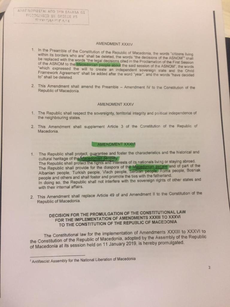 Επίσης, οι «αποφάσεις της Λαϊκής Αντιφασιστικής Απελευθερωτικής Συνέλευσης της Μακεδονίας», πλέον αναφέρονται ως οι «νομικές αποφάσεις που αναφέρονται στη Διακήρυξη της Πρώτης Συνόδου της Λαϊκής Αντιφασιστικής Απελευθερωτικής Συνέλευσης της Μακεδονίας προς το λαό της Μακεδονίας». Η αλλαγή αυτή γίνεται ώστε να περιοριστεί το εύρος της επίκλησης της σχετικής διακήρυξης σε ότι αφορά τη συγκρότηση της ομόσπονδης δημοκρατίας και όχι στο σύνολο των αποφάσεων της Συνέλευσης που περιλάμβαναν και διεκδικήσεις που η ελληνική πλευρά θεωρεί αλυτρωτικές.