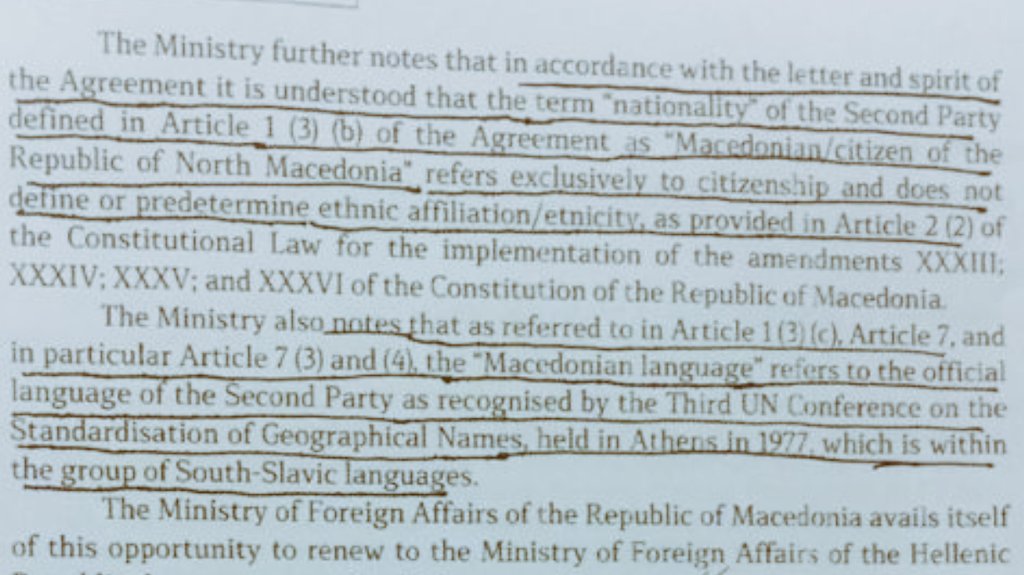 Το ίδιο το περιεχόμενο της ρηματικής διακοίνωσης ανακεφαλαιώνει τα όσα ξέραμε ότι είχαν ψηφιστεί από την εθνοσυνέλευση της ΠΓΔΜ σε εκτέλεση των όσων προβλέπει η Συμφωνία των Πρεσπών. Περιλαμβάνει, δηλαδή, τις τέσσερις τροποποιήσεις του Συντάγματος της ΠΓΔΜ (XXXIII, XXXIV, XXXV, XXXVI) που ψηφίστηκαν και τον ειδικό συνταγματικό νόμο που τις θέτει σε ισχύ.