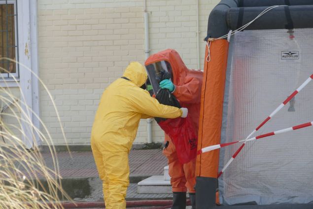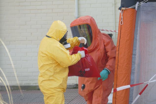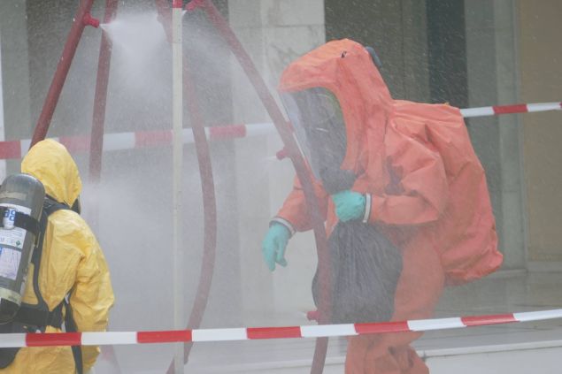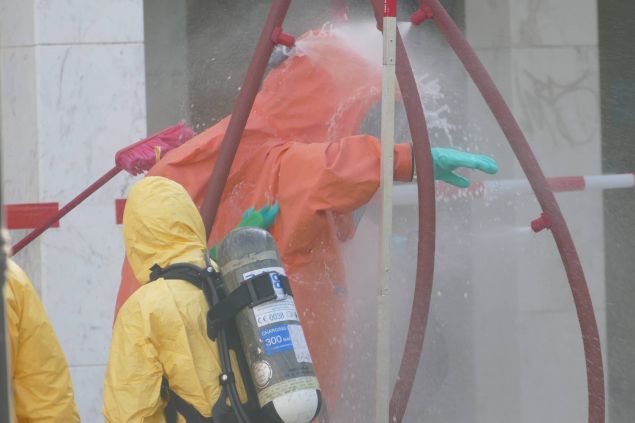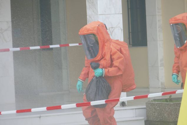 Ο ύποπτος φάκελος βγήκε από στέλεχος της ΕΜΑΚ, ο οποίος φορούσε ειδική στολή, μέσα σε μία μαύρη σακούλα, όπως βλέπουμε και στις φωτογραφίες που δημοσίευσε το larissanet.gr. κρατώντας τη σακούλα με το φάκελο πέρασε από «ντουζιέρα» για την πρώτη φάση της απολύμανσης.