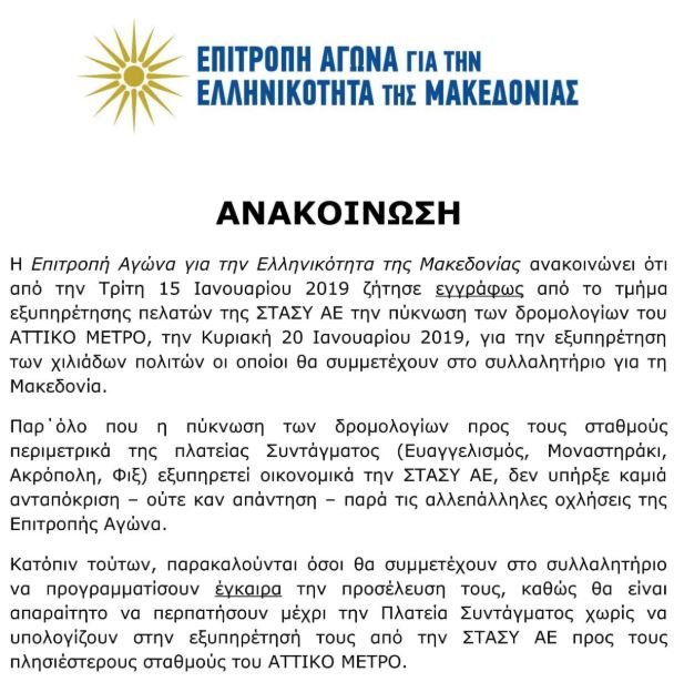 Σε ανακοίνωση μέσω της οποίας αφήνει αιχμές κατά της ΣΤΑΣΥ ΑΕ η Επιτροπή Αγώνα για την Ελληνικότητα της Μακεδονίας, καλεί όσους θα συμμετάσχουν στο συλλαλητήριο για την Μακεδονία να το πράξουν έγκαιρα. Κι αυτό γιατί όπως τονίζει θα είναι κλειστός ο σταθμός Μετρό στο Σύνταγμα.