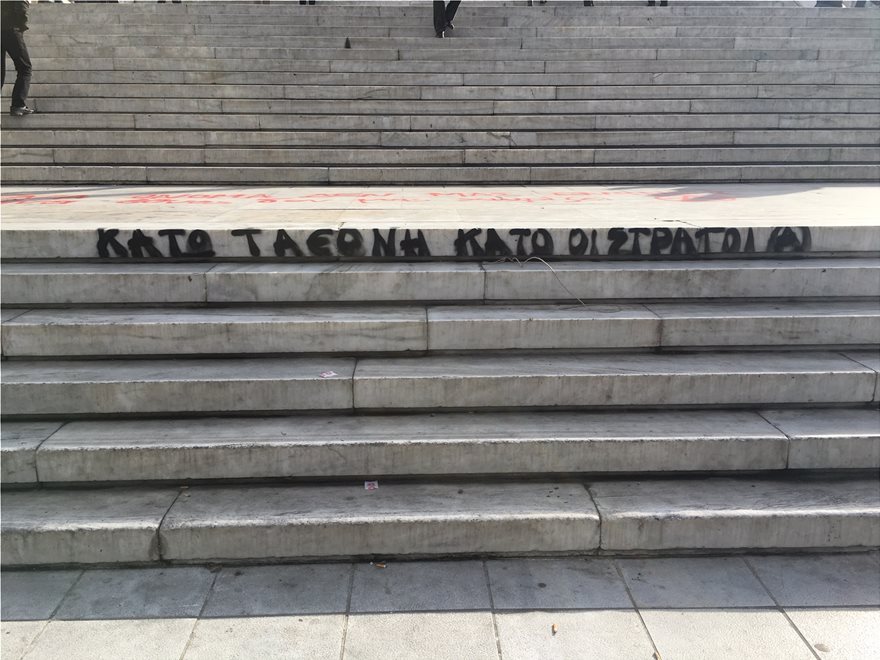 Μια δυσάρεστη έκπληξη περίμενε τους πρώτους διαδηλωτές που βρέθηκαν στην πλατεία Συντάγματος καθώς σε όλη την έκτασή της είχαν γραφτεί συνθήματα από αντεξουσιαστές.