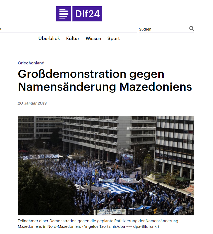 To γερμανικό δίκτυο «Tagesschau», αναφέρει:«Μόνο μία «Μακεδονία» υπάρχει… Η αλλαγή του ονόματος της πΓΔΜ σε «βόρεια Μακεδονία» διχάζει πολλούς Έλληνες. Δεκάδες χιλιάδες άτομα διαμαρτύρονται στο Σύνταγμα».