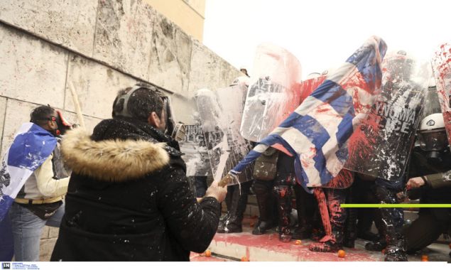Ενδεικτική της κατάσταση η παρακάτω εικόνα. Τα ΜΑΤ γεμάτα μπογιές κάνουν τείχος με τις ασπίδες και ένας εξ αυτών είναι έτοιμος να «ψεκάσει» με χημικά.