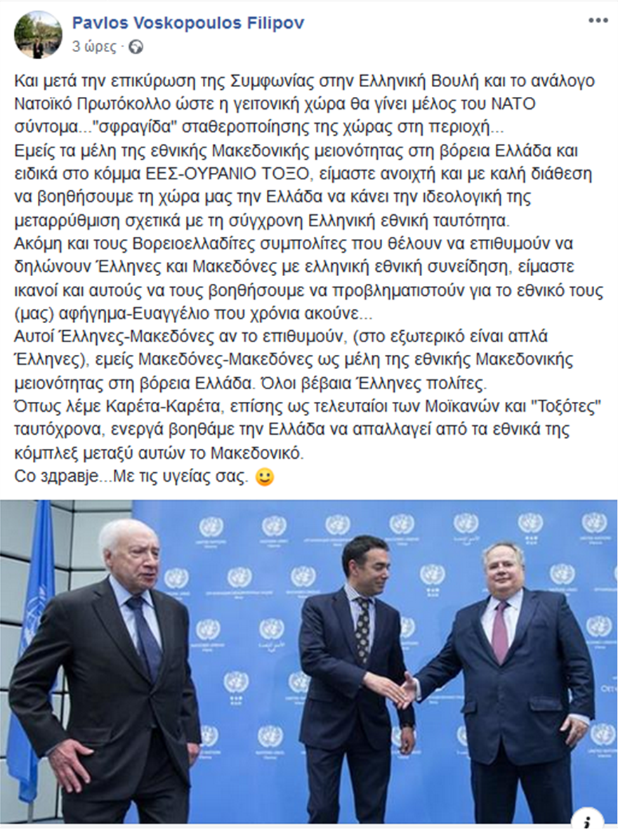 «Και μετά την επικύρωση της Συμφωνίας στην Ελληνική Βουλή και το ανάλογο Νατοϊκό Πρωτόκολλο ώστε η γειτονική χώρα θα γίνει μέλος του ΝΑΤΟ σύντομα…”σφραγίδα” σταθεροποίησης της χώρας στη περιοχή… Εμείς τα μέλη της εθνικής Μακεδονικής μειονότητας στη βόρεια Ελλάδα και ειδικά στο κόμμα ΕΕΣ-ΟΥΡΑΝΙΟ ΤΟΞΟ, είμαστε ανοιχτοί και με καλή διάθεση να βοηθήσουμε τη χώρα μας την Ελλάδα να κάνει την ιδεολογική της μεταρρύθμιση σχετικά με τη σύγχρονη Ελληνική εθνική ταυτότητα.