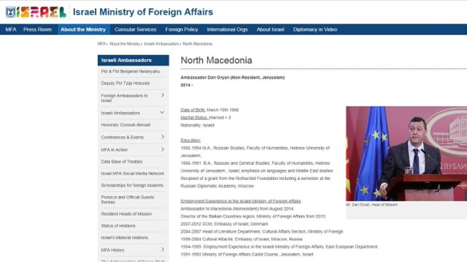 Στη σελίδα όπου παρουσιάζονται τα βιογραφικά του νυν και των πρώην Ισραηλινών πρεσβευτών στα Σκόπια, η ονομασία της χώρας έχει αλλαχθεί σε «North Macedonia» και η χώρα καταχωρήθηκε υπό το γράμμα «N» (=North Macedonia).