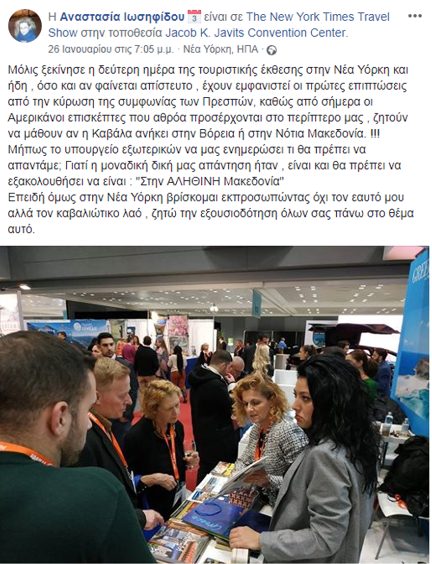 Σάλο έχει προκαλέσει η ερώτηση Αμερικανών επισλεπτώνστην διεθνή τουριστική έκθεση που πραγματοποιείται στη Νέα Υόρκη και στην οποία συμμετέχει η Περιφέρεια Ανατολικής Μακεδονίας και Θράκης και ήθελαν να μάθουν αν η Καβάλα ανήκει στη «Βόρεια» ή στη «Νότια Μακεδονία»!
