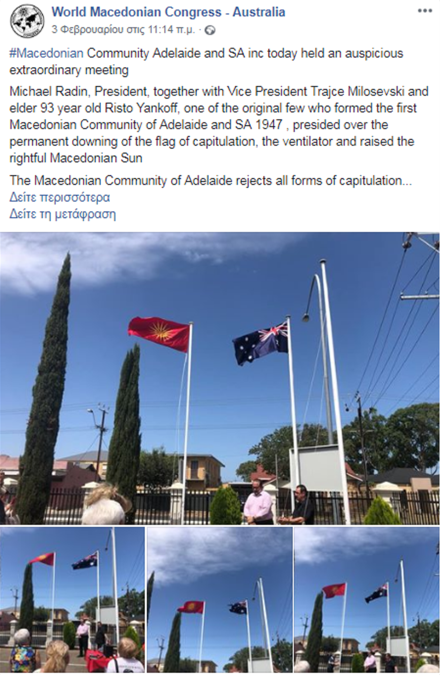 Η επικείμενη αλλαγή της συνταγματικής ονομασίας των Σκοπίων σε «Βόρεια Μακεδονία», προκαλεί την αντίδραση του παραρτήματος Αυστραλίας του λεγόμενου «Παγκόσμιου Μακεδονικού Συνεδρίου» (“World “Macedonian” Congress – Australia), ζητώντας από τους απόδημους Σκοπιανούς της χώρας, να υψώσουν έξω από τα σπίτια τους την ψευδεπίγραφη σημαία με τον Ήλιο της Βεργίνας.