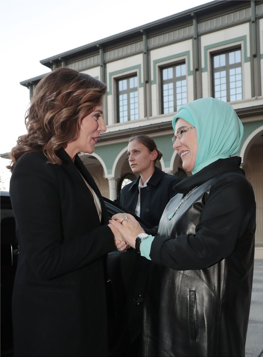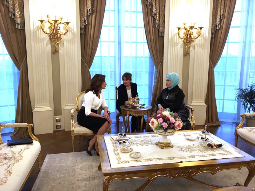 Νωρίτερα τσάι και χαμόγελα είχαν επικρατήσει στο «Λευκό Παλάτι» κατά τη διάρκεια της συνάντησης που είχαν η σύζυγος του Τούρκου προέδρου, Εμινέ Ερντογάν, με την Περιστέρα Μπαζιάνα.