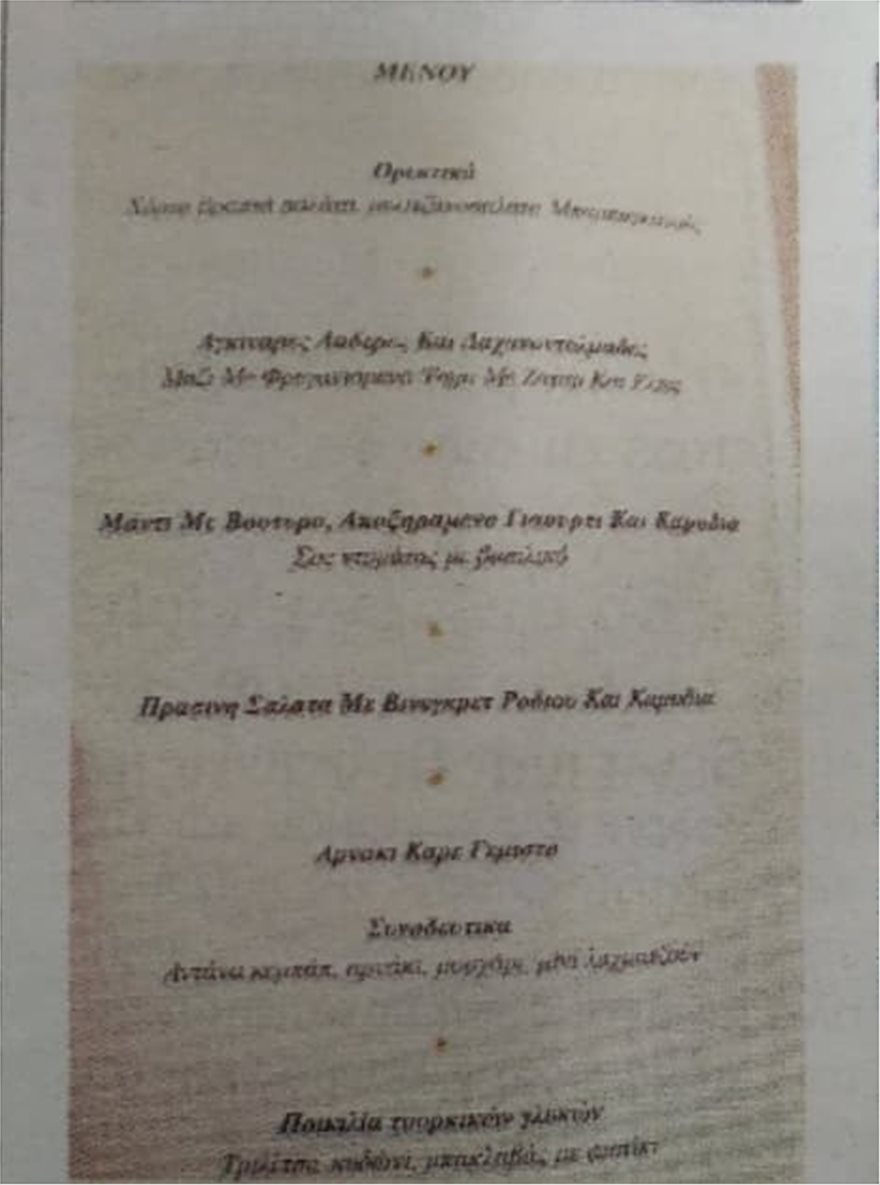 Το μενού του δείπνου το οποίο συνοδεύτηκε από τους ήχους του μπουζουκιού, είχε μεταξύ άλλων, όπως αναφέρει ο Ελεύθερος Τύπος: