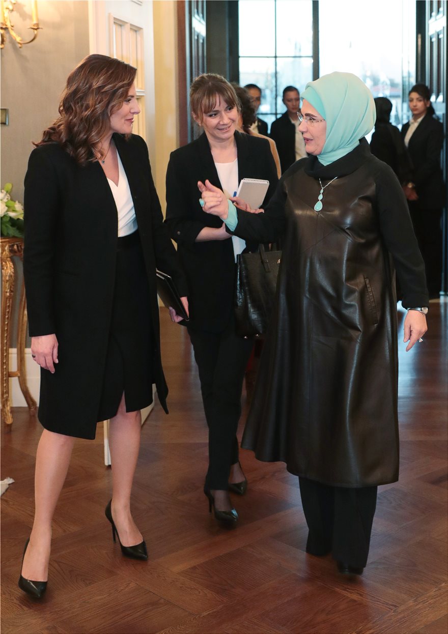 Η κυρία Ερντογάν επεφύλαξε θερμή υποδοχή στην κ. Μπαζιάνα, ως ανταπόδοση της δικής της φιλοξενίας στην Αθήνα, καλωσόρισε την κ. Μπαζιάνα, τη ρώτησε για το ταξίδι, την οικογένεια και τα παιδιά της.