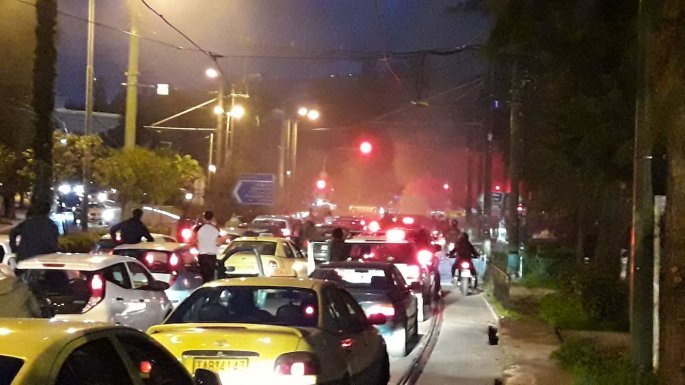 Η ουρά των οχημάτων στο ρεύμα της καθόδου ξεκινά από το Καλλιμάρμαρο. Στην περιοχή βρίσκονται αστυνομικές δυνάμεις και πυροσβεστικά οχήματα για την κατάσβεση της πυρκαγιάς.