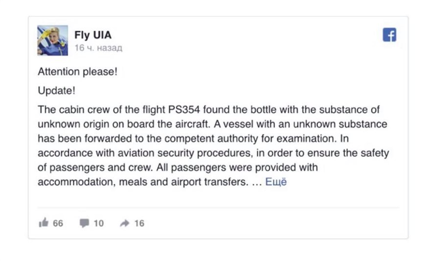 Δεκάδες συμπατριώτες μας επρόκειτο να πετάξουν χθες το μεσημέρι απευθείας για Κίεβο από Αθήνα με την πτήση PS 354 των Ουκρανικών αερογραμμών, όταν οι Αρχές του «Ελ. Βενιζέλος» ειδοποιήθηκαν για τον εντοπισμό υγρού άγνωστης προέλευσης μέσα στη καμπίνα του αεροπλάνου, κατά τη διάρκεια του τυπικού ελέγχου πριν την απογείωση.