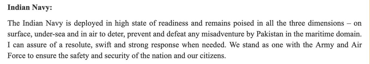 «Το ινδικό Ναυτικό αναπτύσσει σε κατάσταση υψηλής ετοιμότητας και παραμένει έτοιμο και στις τρεις διαστάσεις του –στην επιφάνεια, κάτω από την επιφάνεια και στον αέρα- για να αποτρέψει, να απαγορεύσει και να νικήσει οποιαδήποτε απόπειρα από το Πακιστάν στο θαλάσσιο πεδίο.