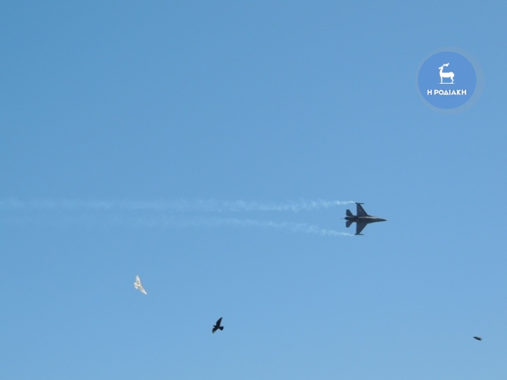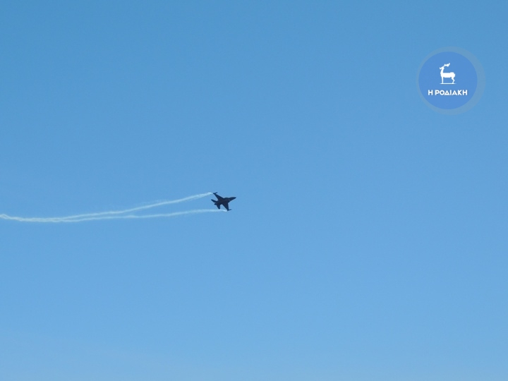 Τα βλέμματα τους προς τον γαλάζιο ουρανό της Ρόδου έστρεψαν εκατοντάδες Ροδίτες, αμέσως μετά την ολοκλήρωση της στρατιωτικής και μαθητικής παρέλασης που πραγματοποιήθηκε σήμερα στο κέντρο της πόλης, για να παρακολουθήσουν το F-16 που συμμετείχε στις εκδηλώσεις.