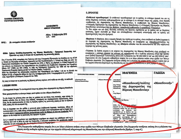 Ειδικότερα, τό έγγραφο του υπουργείου Εξωτερικῶν με θέμα «Σχέσεις Ελλάδας-Δημοκρατίας της Βόρειας Μακεδονίας – Εφαρμογή Συμφωνίας των Πρεσπών ως προς τό όνομα καί τίς ορολογίες της γειτονικής χώρας» αναφέρει τα εξής: