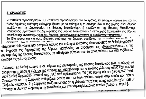 «Σε διεθνή κείμενα ή σε κείμενα της Δημοκρατίας της “Βόρειας Μακεδονίας” είναι αποδεκτό να αναφέρεται η επίσημη γλώσσα της γείτονος ως “μακεδονική”.