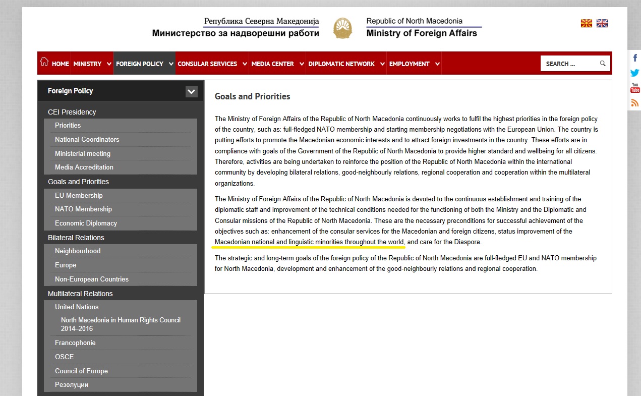 Το ΥΠΕΞ των Σκοπίων παρουσιάζοντας στην ιστοσελίδα του τις προτεραιότητες του περιλαμβάνει σε αυτές, την βελτίωση του καθεστώτος των «Μακεδονικών γλωσσικά και εθνικά μειονοτήτων ανά τον κόσμο» και ενημερώνει την διεθνή κοινή γνώμη για τις «ομορφιές της Μακεδονίας, τα μοναστήρια της Μακεδονίας, τα έθιμα της Μακεδονίας, τα Μακεδονικά κρασιά»…