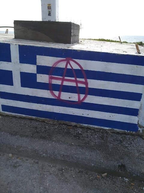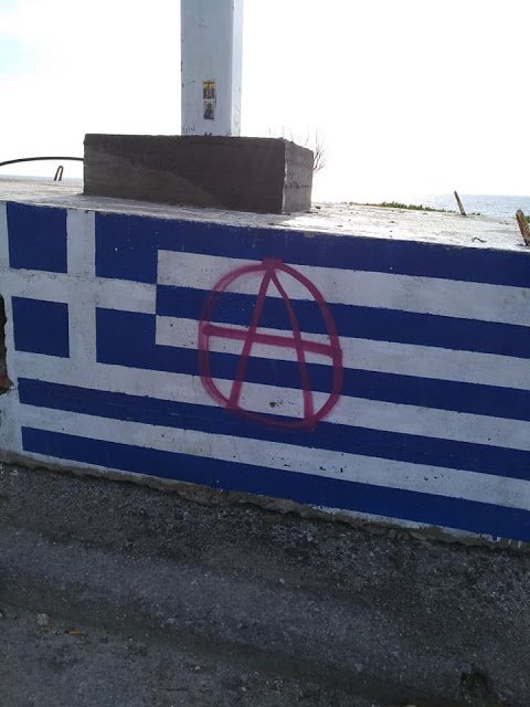 Το βράδυ της Παρασκευής άγνωστοι αφού βεβαιώθηκαν ότι δεν τους παρακολουθεί κανένας έπιασαν δουλειά με τα σπρέι τους και έβαψαν την ελληνική σημαία που βρίσκεται στην βάση του σταυρού με κόκκινο χρώμα σχηματίζοντας το σήμα των αναρχικών, αναφέρει το lesvos post.