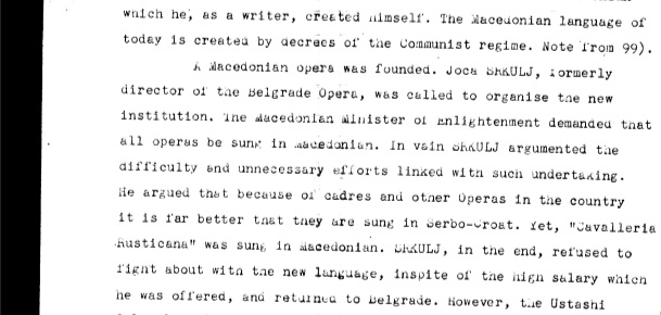 Το έγγραφο κατόπιν αναφέρει ότι δόθηκαν εντολές για να δημιουργηθεί μέχρι και ”Μακεδονική Όπερα” ενώ ”ο Μακεδόνας υπουργός διαφωτισμού απαίτησε όλες οι όπερες να τραγουδάνε στα Μακεδονικά”.