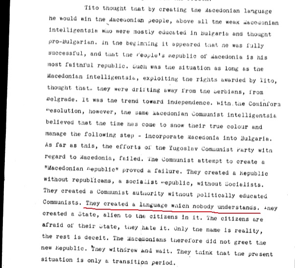 «Δημιούργησαν την μακεδονική γλώσσα. Όλα τα οικογενειακά ονόματα αλλοιώθηκαν. Βιβλία εκτυπώθηκαν στα μακεδονικά, τα οποία οι Μακεδόνες δεν καταλαβαίνουν. Πολλοί κομμουνιστές αντιτίθενται στην καινούργια γλώσσα.