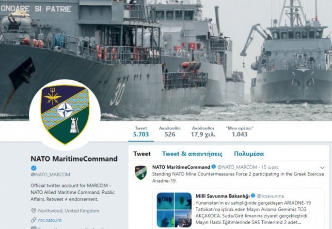 Όπως ανακοίνωσε το υπουργείο Εθνικής Άμυνας «σχετικά με υποβρύχια φωτογραφία που αναρτήθηκε στο λογαριασμό του twitter της Διοίκησης ΝΑΤΟ Allied Maritime Command (MARCOM), η οποία απεικονίζει δύτες με τουρκική σημαία και φέρεται να έχει ληφθεί στη διάρκεια της Νατοϊκής άσκησης «ΑΡΙΑΔΝΗ-19», μετά από εντολή του ΥΕΘΑ Ευάγγελου Αποστολάκη, το ΓΕΝ παρενέβη και αφαιρέθηκε από τον παραπάνω λογαριασμό.Παράλληλα οι ελληνικές αρχές προέβησαν σε σχετικές επισημάνσεις σε επίπεδο Συμμαχίας».