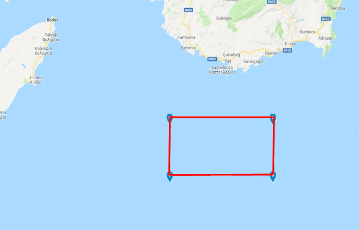 Ταυτόχρονα, την ίδια μέρα με την NAVTEX 0401/19 δεσμεύει εξίσου παράνομα περιοχή νότια του Καστελόριζου για τον ίδιο σκοπό.
