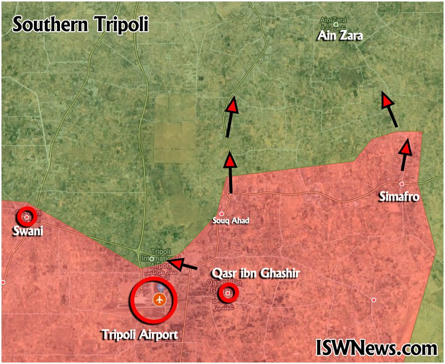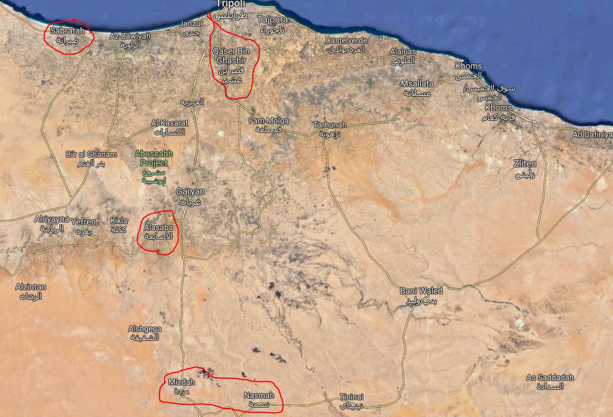 After tooking over the area of Wadi Al-Rabeea, S of #Tripoli, Libyan National Army continue progressing toward the capital. Now clashes broke out in the district of Ain Zara. pic.twitter.com/egISByGv9X